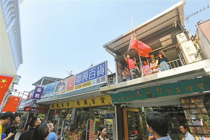 深圳商报2019年10月3日讯 “起来,不愿做奴隶的人们,把我们的血肉,筑成我们新的长城……”10月1日早上9时30分,在中英街香港一侧的33号店铺前,许多游客驻足在街上,仰望着店铺二楼旗杆上升起的国旗,高声唱着国歌。