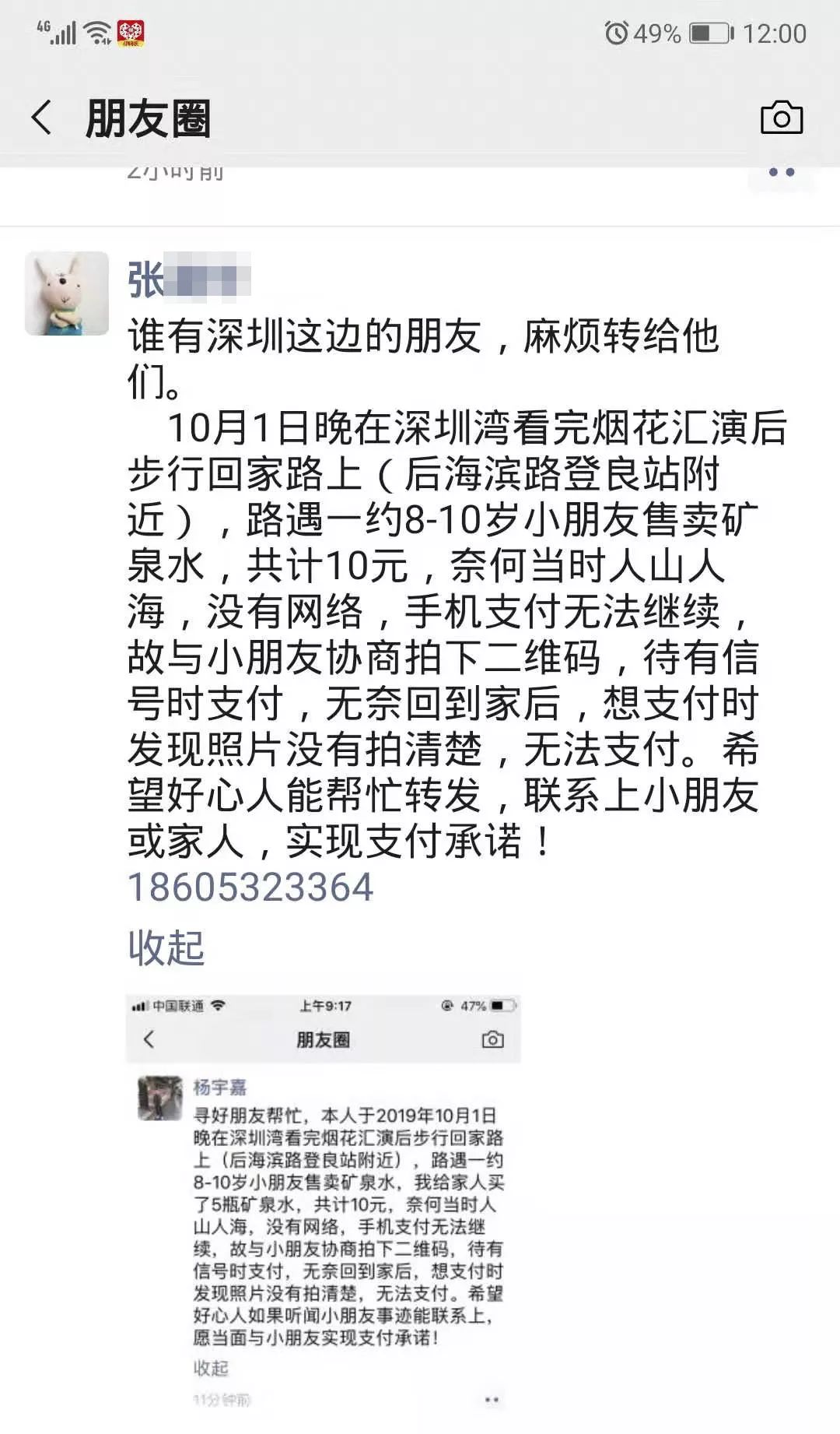 “10月1日晚,在深圳湾看完烟花表演后步行回家路上,路遇一约8-10岁小朋友售卖矿泉水,共计10元,奈何当时人山人海,没有网络信号,手机无法支付,故与小朋友协商拍下二维码,待有信号时支付,无奈回到家后,想支付时发现照片没有拍清楚,无法支付。希望好心人能帮忙转发,联系上小朋友或家人,实现支付承诺!”