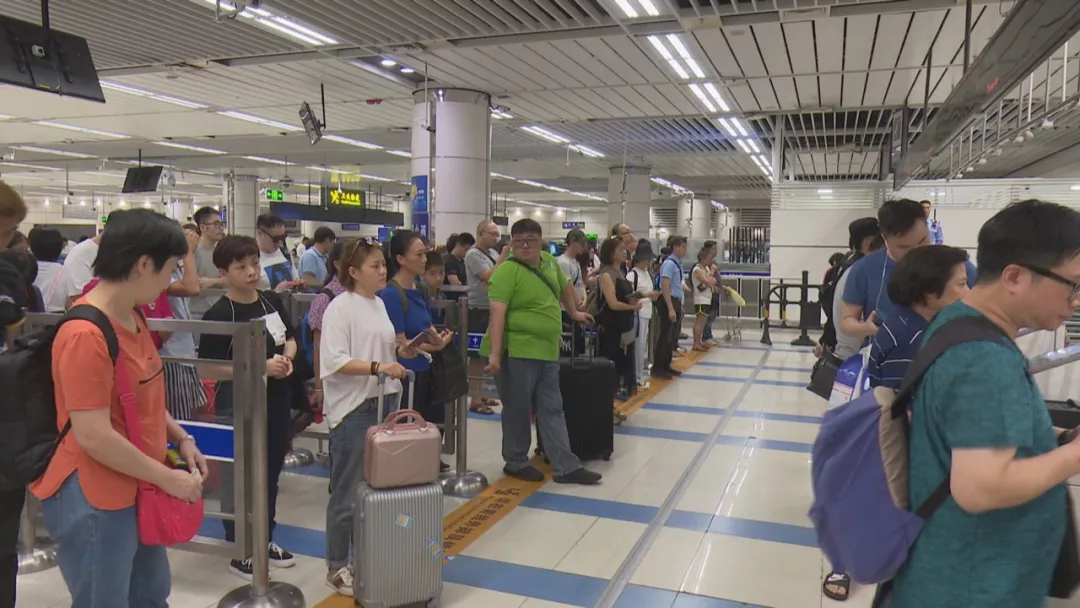 10月5日中午12点,在皇岗口岸的入境大厅,有不少旅客提着大包小包的行李准备排队过关。整个入境大厅15条自助通道和13条人工通道已经全部开启,排队过关的市民都可以在3分钟之内快速通关。