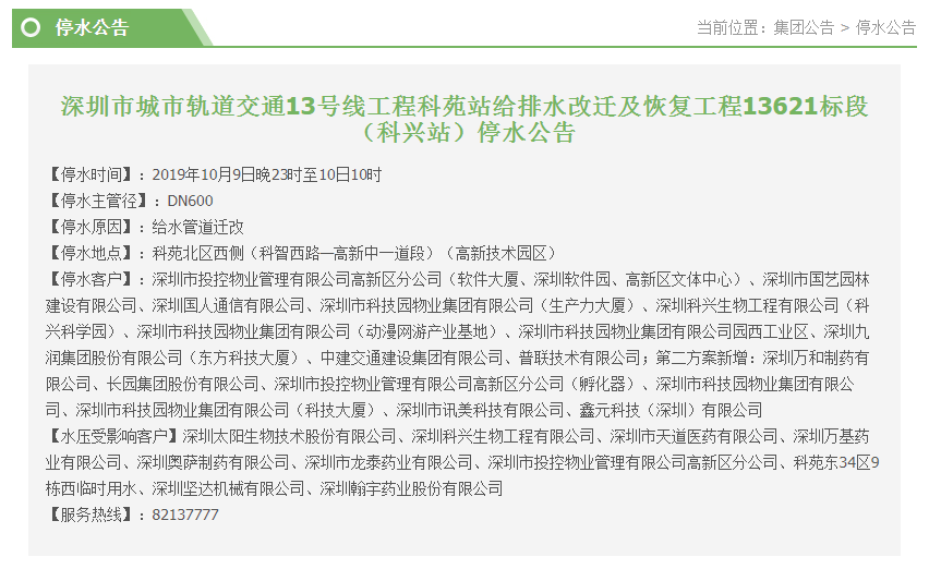 10月9日晚23时至10日10时,因给水管道迁改,科苑北区西侧将停水,停水客户包括中建交通建设集团有限公司、深圳市科技园物业集团有限公司、深圳市迅美科技有限公司等多个企业。