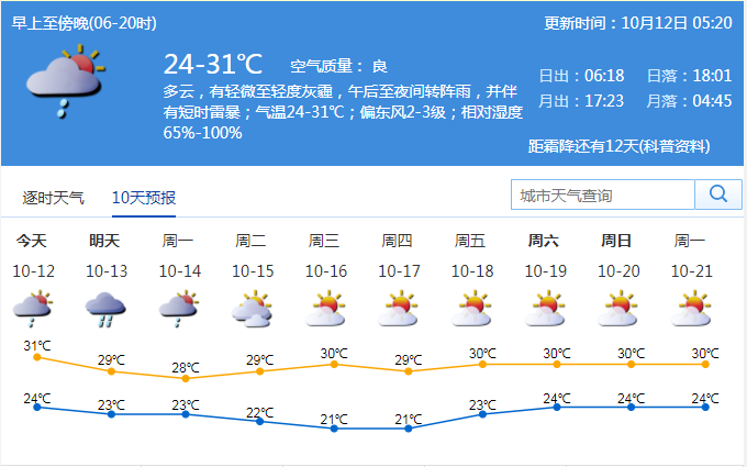 见圳客户端·深圳新闻网2019年10月12日讯 据深圳市气象台消息,今日深圳多云,有轻微至轻度灰霾,午后至夜间转阵雨,并伴有短时雷暴;气温24-31℃;偏东风2-3级;相对湿度65%-100%