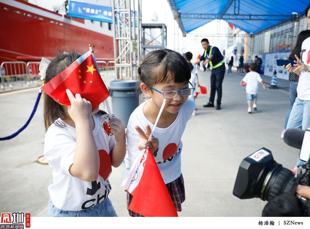 2019年10月14日,蛇口游轮母港CR2码头,两位即将参观“雪龙2”号科考破冰船的孩子们对起镜头比起手势。