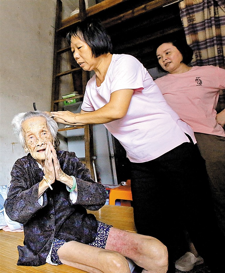 陈汝金老人原是沙井街道沙四社区人,嫁到凤凰社区已有60多年了。她生育了两个女儿,却收获了四个“孝顺儿女”。“我妈妈每个星期都要回来看我外婆,如果外婆有一点不舒服,妈妈和姨妈就会立即赶回来。外婆的两个女婿也非常孝顺,生病的时候,两个女婿轮流抱她或者背她去看医生。”文小姐告诉记者,外婆陈汝金和外公的感情非常好,过去家里大小事都是由外公操心,外婆要操心的事很少,家人给了她无限的包容、关爱和扶持。陈汝金老人也是一个和善热心肠的人,邻居家有事外出,她就主动帮人家看孩子。