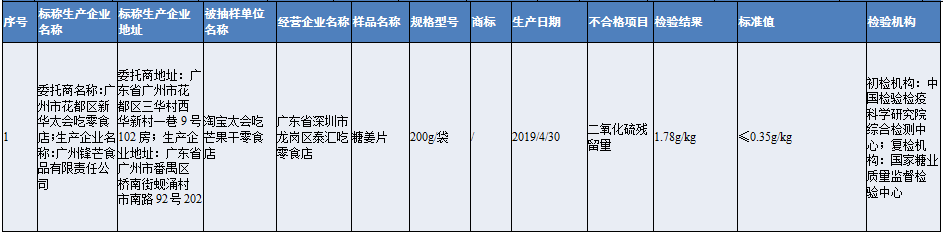 其中,深圳市龙岗区泰汇吃零食店经营的淘宝店销售的糖姜片,被检出二氧化硫残留量不符合食品安全国家标准规定,存在食品添加剂超限量使用的问题。