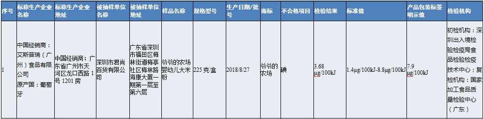 深圳市君尚百货有限公司销售的爷爷的农场婴幼儿大米粉(原产国:葡萄牙),其中碘检出值低于产品包装标签明示值的80%,营养指标不达标。