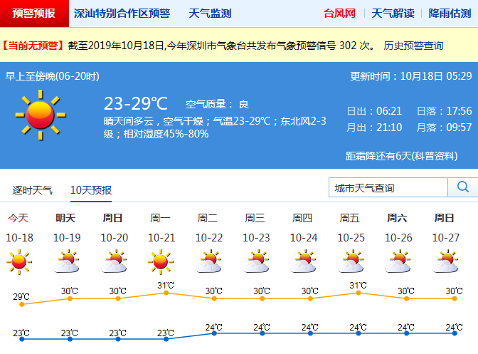 见圳客户端·深圳新闻网2019年10月18日讯 深圳市气象局消息,18日深圳晴天间多云,空气干燥,早晚稍凉,气温23-29℃。19-22日深圳天气持续晴好干燥,周末可以放心出门玩耍;23-24日多云,空气干燥,早晚有轻雾。