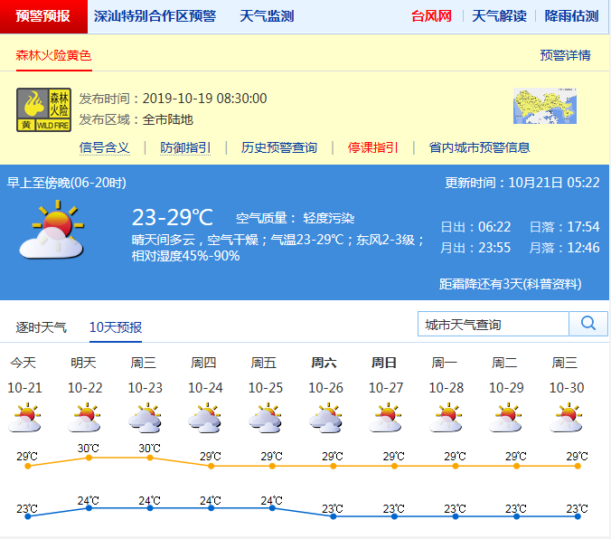 见圳客户端·深圳新闻网2019年10月21日讯 深圳未来一周天气较为稳定,天气持续干燥,预计21日晴天间多云,早晚能见度较差,有轻雾;气温23-29℃;东风2-3级;相对湿度45%-90%。22日晴天间多云,早晚有轻雾;23-24日多云,偶有零星小雨,早晚有轻雾;25-27日晴天干燥。