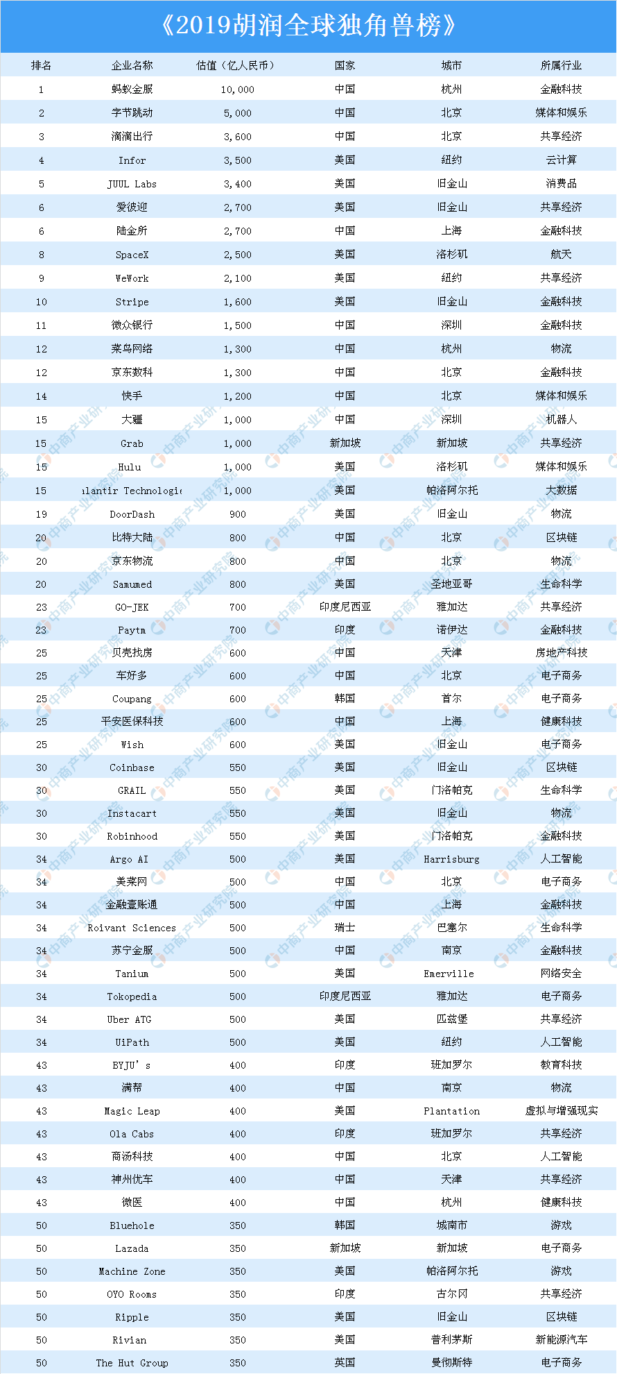 据悉,这是胡润研究院首次发布全球独角兽榜。此次榜单对全球估值10亿美元以上的科技初创企业排名,上榜企业要求创办不超过10年,获得过私募投资且未上市。本次榜单估值计算截止日期为2019年6月30日。