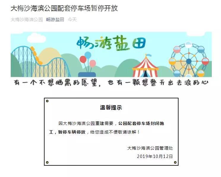另外,大梅沙海滨公园管理处2019年10月12日发布公告称:因大梅沙海滨公园重建需要,公园配套停车场封闭施工,暂停车辆停放。
