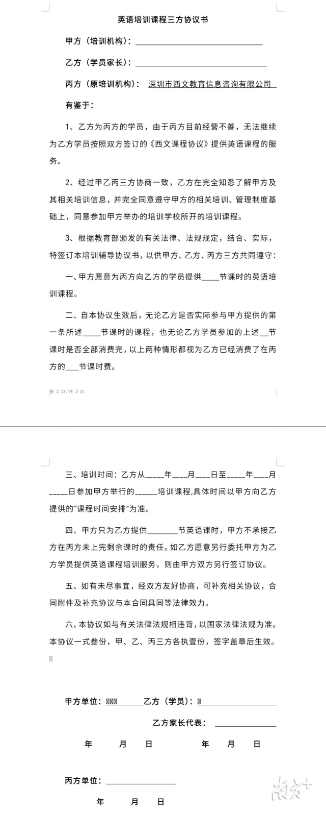 退费群里的周女士介绍,10月20日,西文英语提供了一份“英语培训课程三方协议书”,但上面很多条款都没有写清楚。西文英语委托的律师称,山姆大叔少儿英语愿意给西文英语的学员免费提供30节课程,但学员在西文英语其他剩余课时的解决方案,需自行和山姆大叔协商。