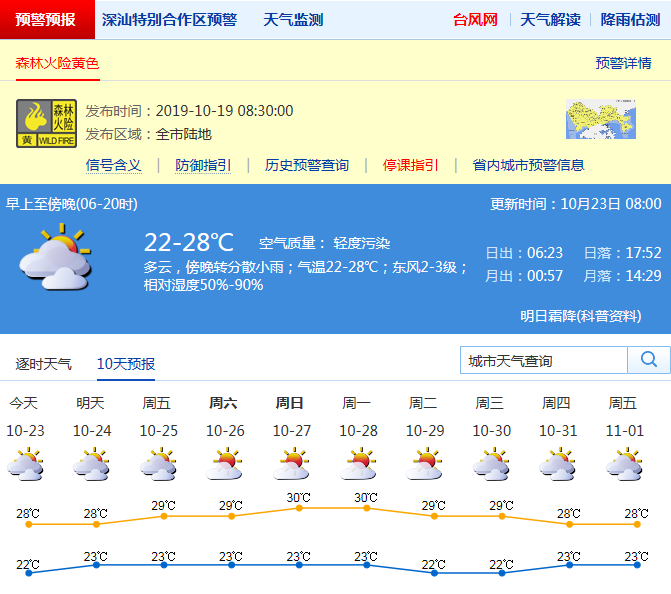 见圳客户端·深圳新闻网2019年10月23日讯 近期深圳天气持续干燥。深圳市气象台预计,23-24日云量增多有分散小雨:23日云量增多,有分散小雨,24日分散小雨转多云,最低气温21-22℃、最高气温27-28℃;25-29日多云到晴,空气干燥。