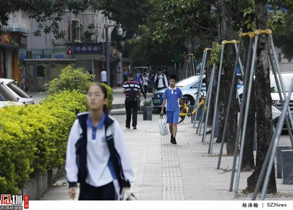 两位分别穿夏装和冬装的学生。2019年10月24日,上学高峰期,福田新洲。