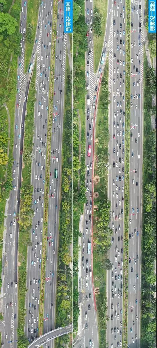 这一次改造历时4个月,目前通行数据显示,该路段总体运行效率较改善前提升12%,高峰期路段平均车速由改善前的22.4km/h提高到40.4km/h。