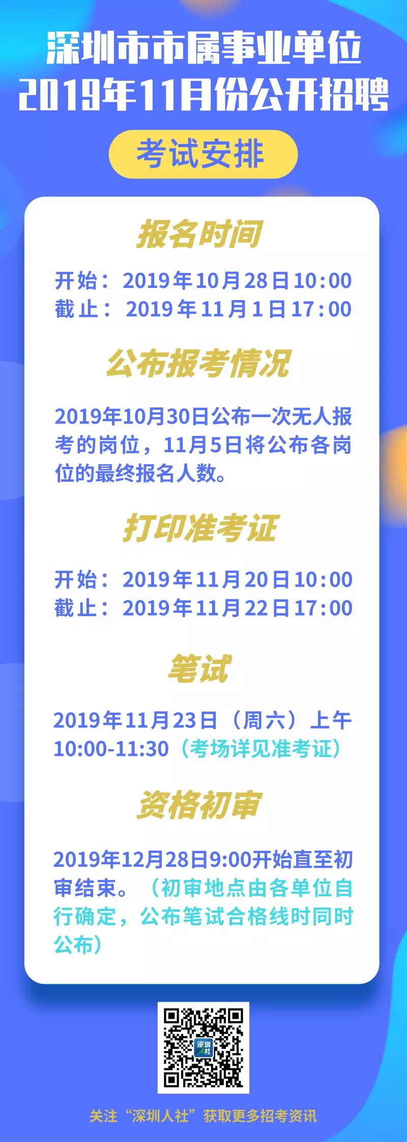 见圳客户端·深圳新闻网2019年10月25日讯(见圳客户端深圳新闻网记者 何畅)据“深圳人社”微信公众号消息,深圳市市属事业单位2019年11月份公开招聘公告正式出炉。此次一共招聘管理和专业技术岗位工作人员122名,面向社会人员和应届生的岗位均有。