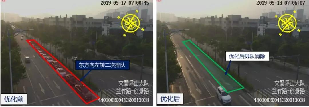 针对这一问题,深圳交警根据路口各时段、各方向的通勤需求,调整优化了路口红绿灯配时方案,适当增加了拥堵方向时间。优化后,路口晚高峰西往东方向车辆排队由300多米降至60米左右,下降80%,车辆基本实现1次通行。