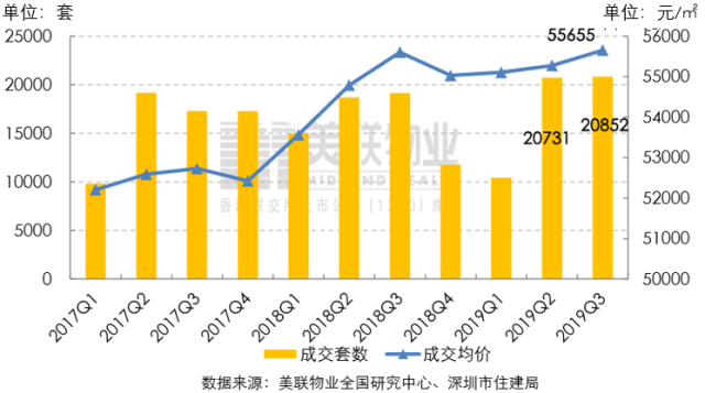 2019年第三季度二手住宅市场延续第二季度成交热度,共备案20852套二手住宅,再创三年来季度成交量新高,较今年第二季度上升0.6%,同比去年第三季度上升8.9%;总成交面积约173.80万㎡。美联物业(深圳)蓝筹住宅价格方面,今年第三季度全市二手住宅的成交均价为55655元/㎡,较第二季度上涨0.7%,同比去年第三季度上涨0.1%。