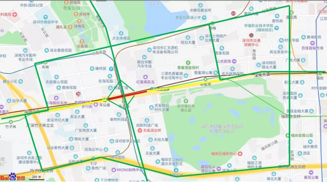 深南大道西往东方向过境车辆,建议通过广深高速竹子林立交转滨河大道或农林路转红荔路绕行。深南大道东往西方向过境车辆,建议通过新洲路转滨河大道,或新洲路、香梅路转红荔路绕行。