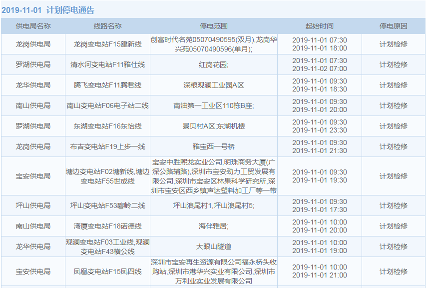 11月1日-15日,深圳这些地方将停电(附全名单)