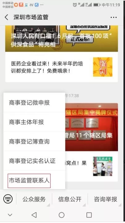 商事主体关注“深圳市场监管”微信公众号,点击“公众服务-市场监管联系人”,可设置、修改市场监管联系人信息。