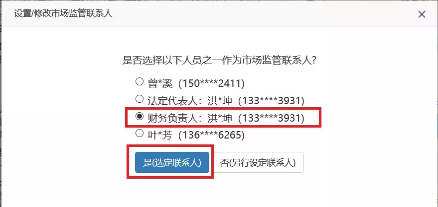 第三步:弹出备选的市场监管联系人信息,选择一名,点击“是(选定联系人)”。