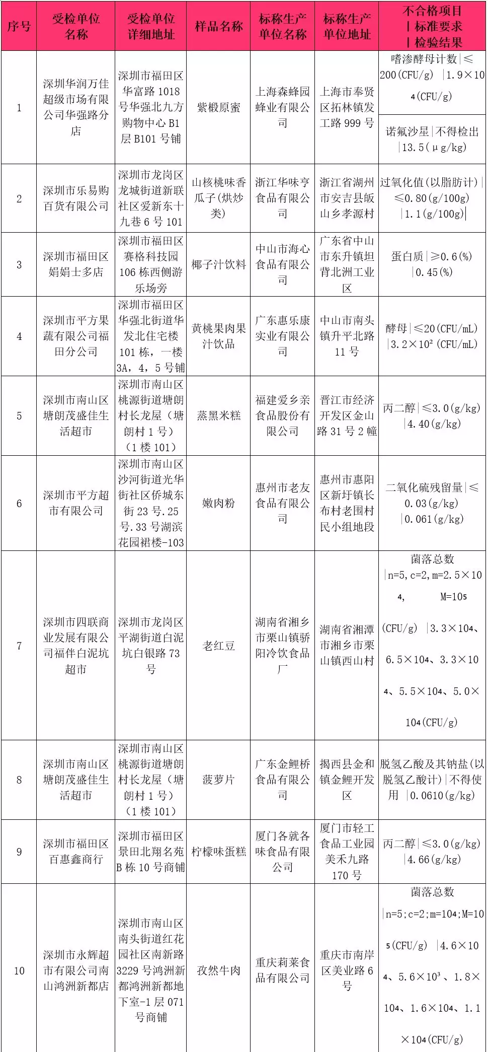 本次共抽检流通环节食品918批次,涉及流通环节经营主体230家次,共检测食品指标5434项次。其中检出不合格样品10批次,涉及不合格食品类别有炒货食品及坚果制品1批次,淀粉及淀粉制品1批次,蜂产品1批次,糕点2批次,冷冻饮品1批次,肉制品1批次,水果制品1批次,饮料2批次;涉及不合格项目类别为兽药残留、品质指标、微生物污染、食品添加剂。