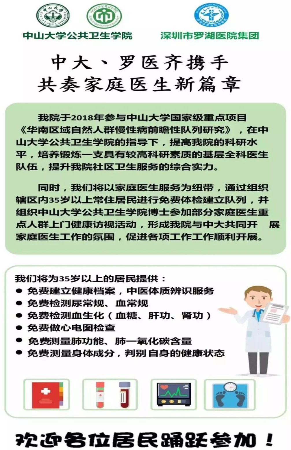 近日,罗湖医院集团参与了中山大学国家级重点项目《华南区域自然人群慢性病前瞻性队列研究》,将以家庭医生服务为纽带,通过组织辖区内35岁以上常住居民进行免费体检建立队列。