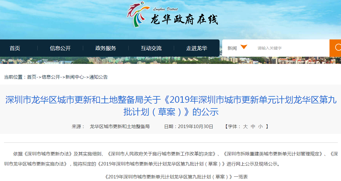 见圳客户端·深圳新闻网2019年11月5日讯 10月30日,龙华区城市更新和土地整备局发布了《2019年深圳市城市更新单元计划龙华区第九批计划(草案)》的公示,更新地点分别在龙华街道、大浪街道,其中,龙华街道将建21600平方米高中用地一处,不少于9班幼儿园一所;大浪街道要落实用地面积不少于9132平方米的义务教育用地一处。
