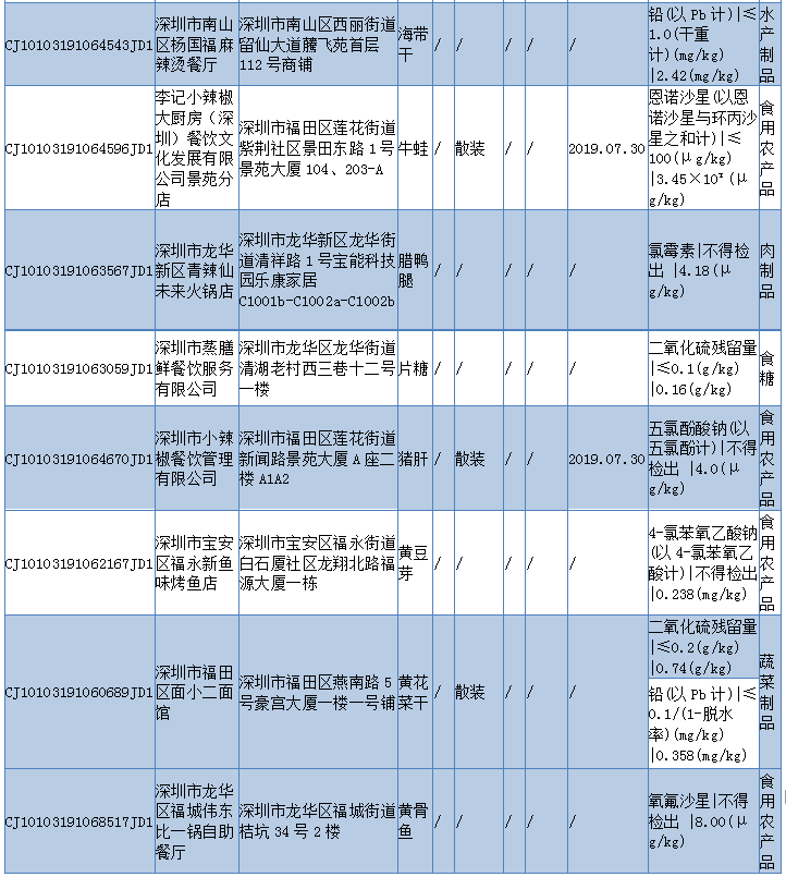 见圳客户端 ·深圳新闻网2019年11月6日讯 11月5日,深圳市市场监督管理局发布2019年第四十期食品安全抽样检验情况通报,通报称,深圳市市场监督管理局于2019年8-9月组织对我市餐饮环节的食品开展了抽样检验工作,本次共抽检餐饮环节食品671批次,涉及餐饮环节经营主体584家次,共检测食品指标3385项次。其中检出不合格样品12批次,涉及不合格食品类别有酒类2批次均为米酒;肉制品2批次为腊肉和腊鸭腿;食糖1批次、食用农产品5批次牛蛙、猪肝等在列;蔬菜制品1批次、水产制品1批次。