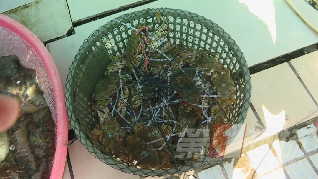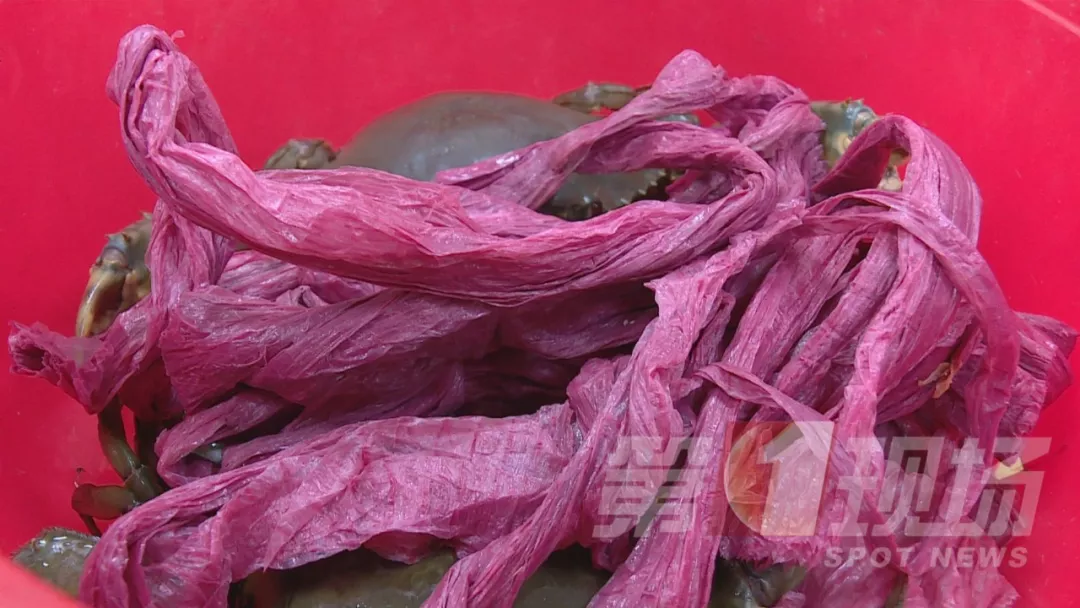 ▲粗大的红色绑蟹绳,吸水后重半斤,这样的膏蟹商家卖85元/斤。