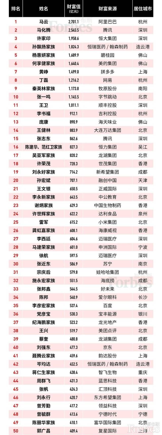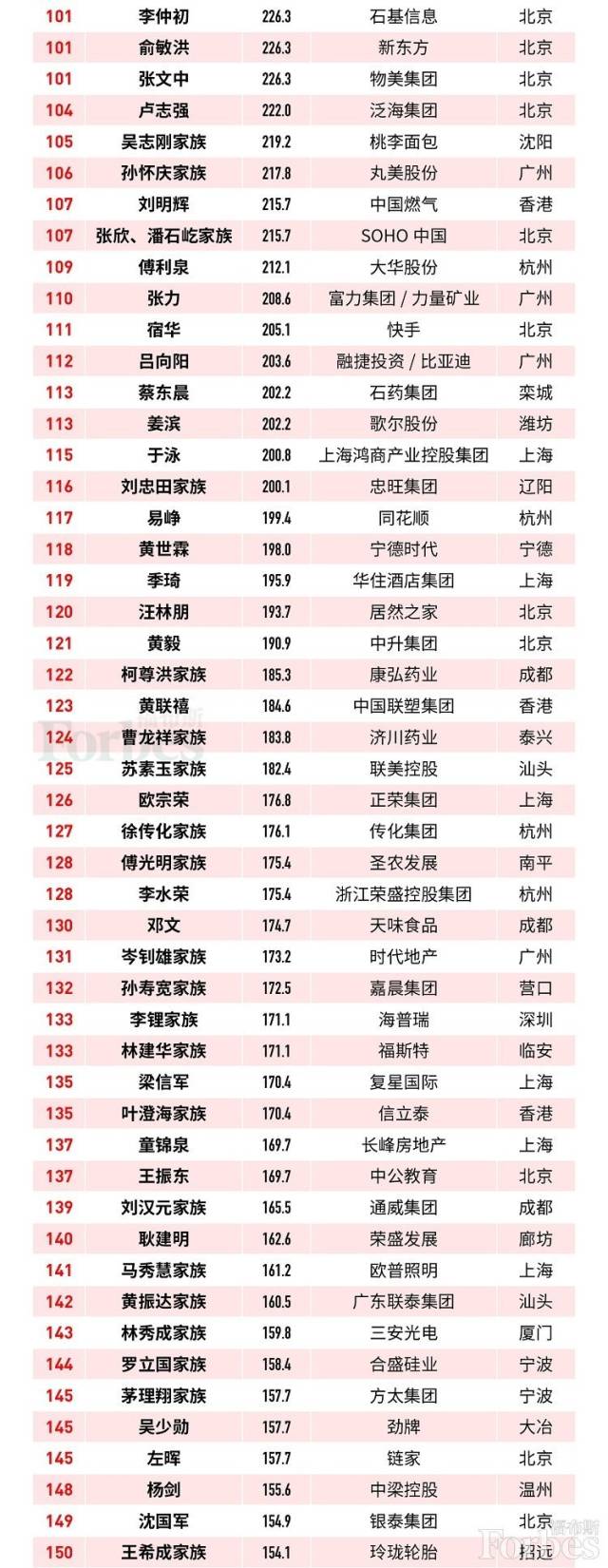 编制本榜单使用的持股和财务信息取自家族和个人、证交所、分析师和监管机构。资产计算使用的是截至10月25日的股价和汇率。非上市公司的估值基于对同类上市公司的分析评估。被抵押股权予以折价计算。与福布斯全球亿万富豪榜不同,福布斯中国富豪榜包括参与配偶生意的夫妇。一些估算还包括其他家族成员拥有的资产。