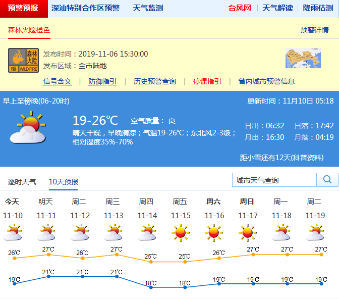 见圳客户端·深圳新闻网2019年11月10日讯 深圳市气象台预计10-11日晴天间多云,空气非常干燥,早晚清凉,10日气温19-26℃;12日云量增多,13-14日受冷空气影响,北风明显加大,气温下降;15-17日晴天干燥,早晚清凉。