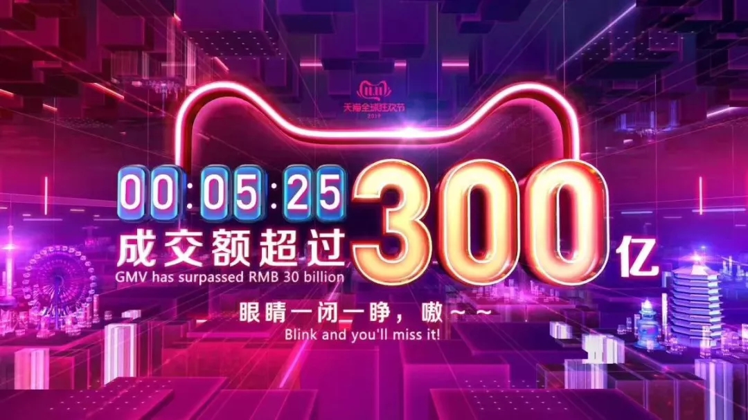 5分25秒,天猫双十一销售额突破300亿元