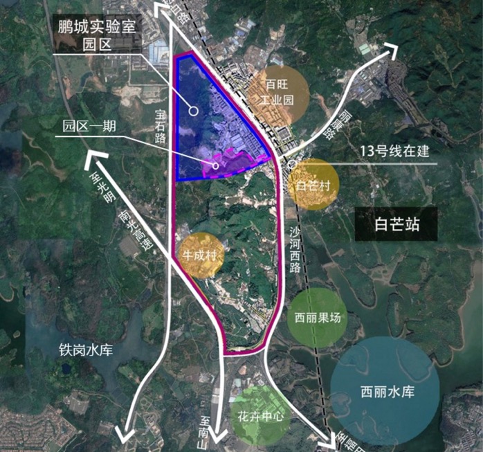 鹏城实验室目前以留仙洞战略性新兴产业基地万科云城一期8栋为实验室过渡场地。规划园区位于石壁龙园区,坐落于南山西丽湖国际科教城重点规划片区—石壁龙片区。距离深圳宝安机场12公里,距离规划中的西丽高铁站6公里,对外交通十分便利。同时,基地被铁岗水库、羊台山森林公园、西丽水库环绕,自然环境优势明显。并且项目靠近深圳大学城,科研创新氛围浓厚。