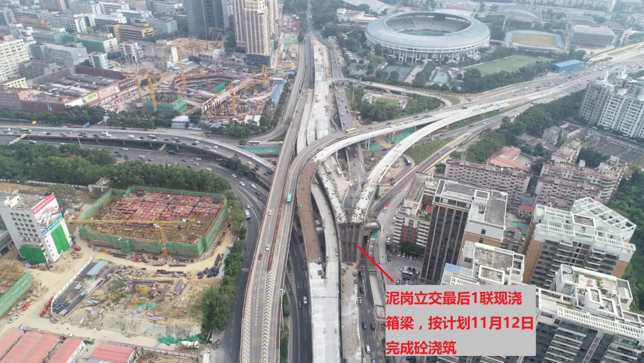 坂银通道工程北环立交、泥岗立交桥梁主体工程完成最后1联砼箱梁浇筑