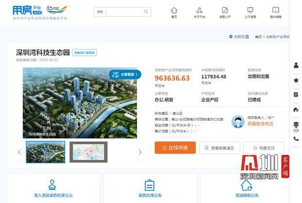 记者在平台官网看到,平台不仅提供创新型产业用房申请入口、平台专享金融服务、企业空间需求申报,还设有深圳产业空间地图、720度全景看房,页面简洁直观。