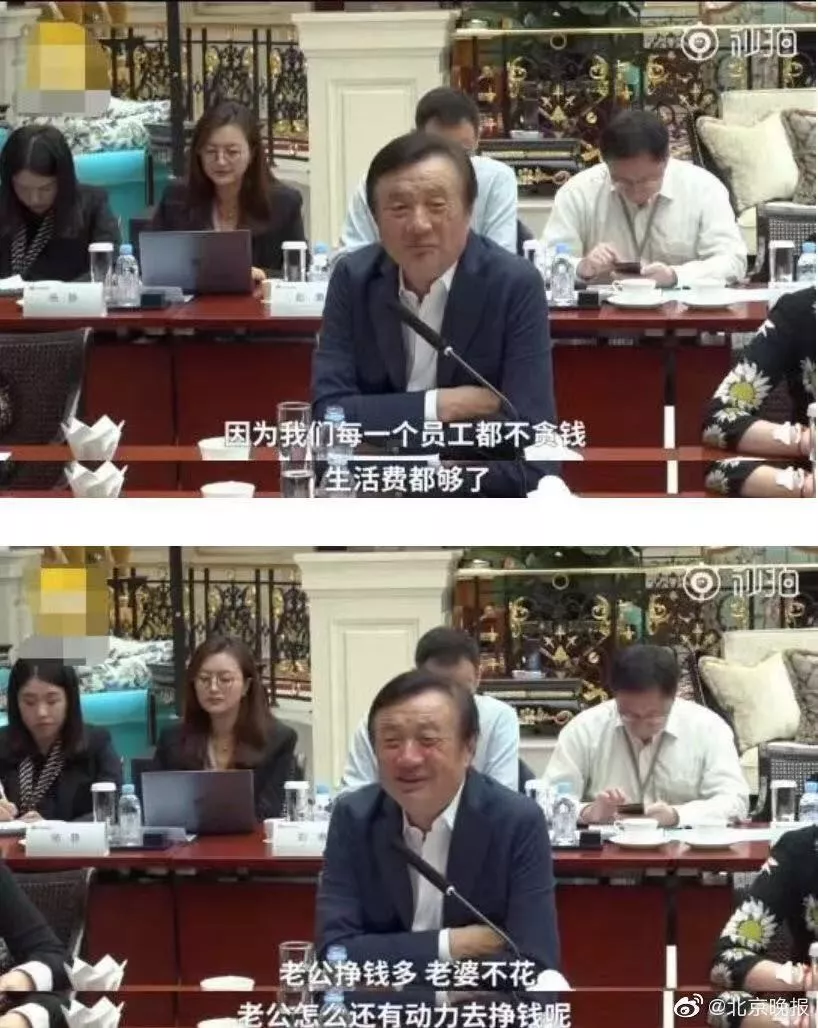 5月21日,任正非在华为总部接受采访时,谈到华为每年花200亿美元在研发上,即使华为财务受到一点挫折也不会影响科研投入,因为员工都不贪钱,生活费都够了。“你去问奢侈品店里买几个包的,老公是哪里的?华为的。老婆不花,老公怎么有动力去挣钱呢?”
