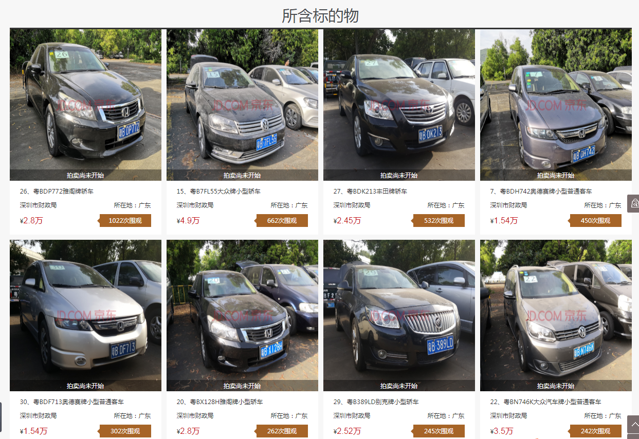 13日,晶报APP记者登录京东网络拍卖平台,已经可以看到这批拍卖车辆的信息。其中,第二场标的序号40(粤B327KW奥德赛牌小型普通客车)、标的序号49(粤B08566丰田牌小型轿车)已撤拍。
