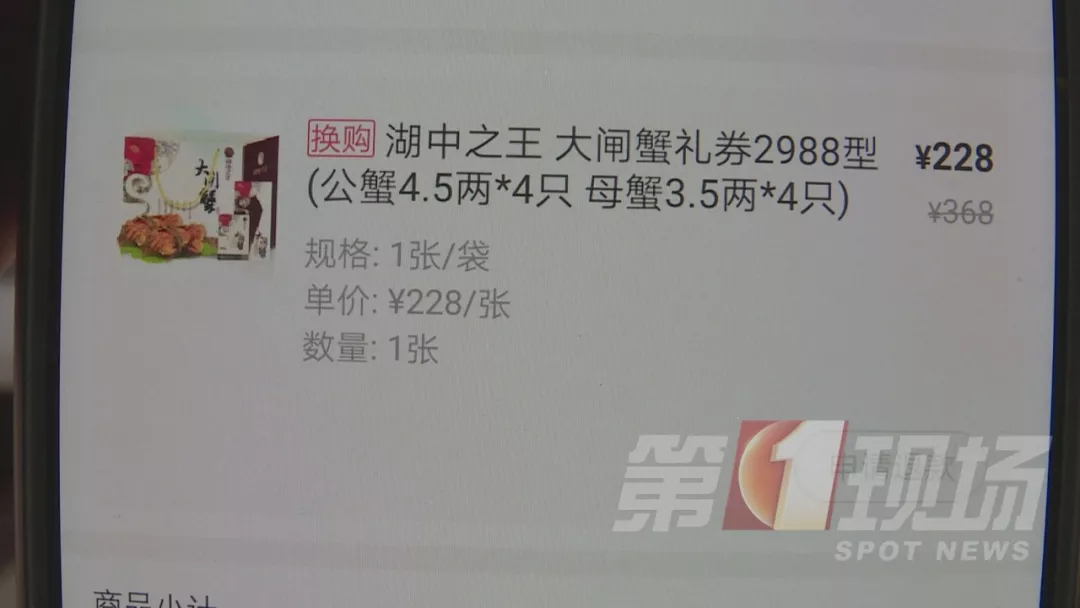 今年9月份,张先生在盒马鲜生APP上,花228元购买了一张大闸蟹礼券,礼券上清楚写明,可以兑换4只225克的公蟹,和4只175克的母蟹。