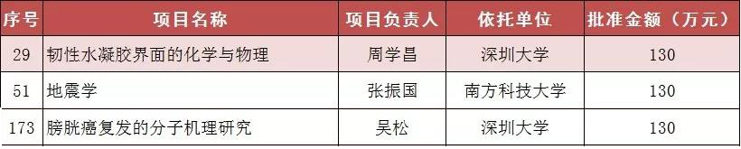 深圳大学2个,分别是:韧性水凝胶界面的化学与物理(项目负责人:周学昌);膀胱癌复发的分子机理研究(项目负责人:吴松);