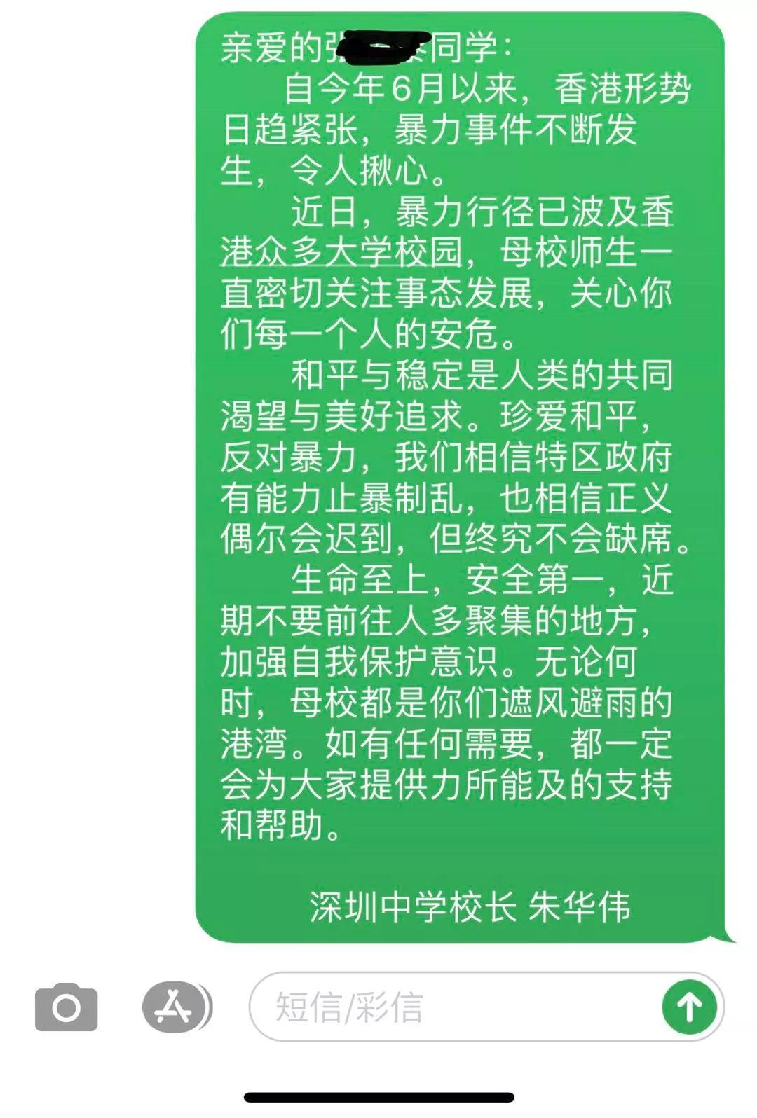 此外,深圳中学校长朱华伟还向在港的深中学子发送了问候短信,希望他们多注意自身安全,“无论如何,母校都是你们遮风避雨的港湾”,让收到短信的学子倍感温暖。