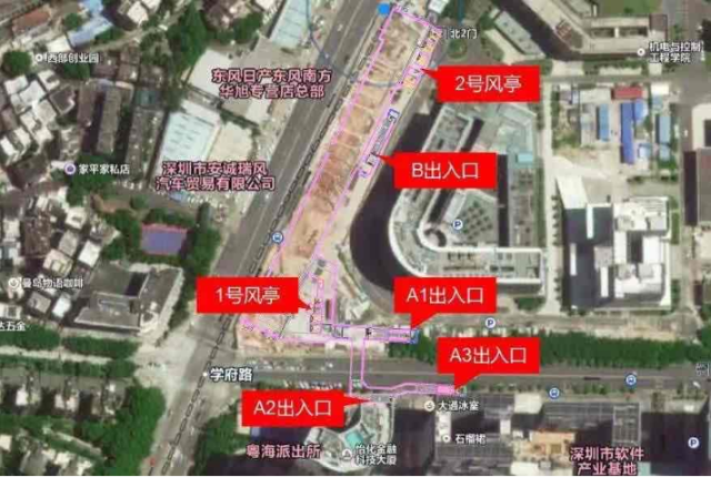 深大南站位于学府路与白石路交界处北侧,车站出入口共计4个:A1出入口、A2出入口、A3出入口、B出入口,其中A1出入口位于深圳大学基础实验楼一期南侧,B出入口位于深圳大学基础实验楼一期西侧
