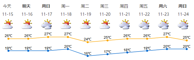 我市晴天间多云,空气干燥;气温19-26℃;东北风2-3级;相对湿度40%-85%。