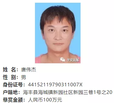 汕尾市公安局于11月11日发布的通告中,共有3人被悬赏通缉,分别是郑海田(金额100万)、唐伟杰(金额100万)、洪水生(金额50万)。