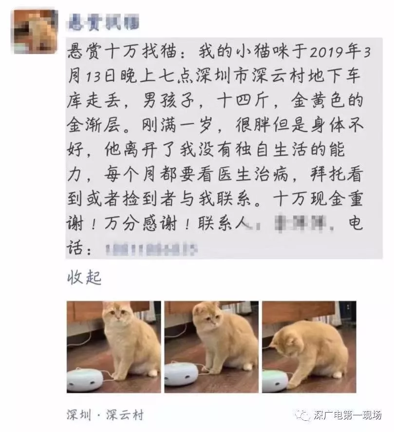 我们栏目之前也报道过此类“重金寻宠物”的事件。今年三月深云村居民李女士在朋友圈发布“十万重金寻猫”的启事。