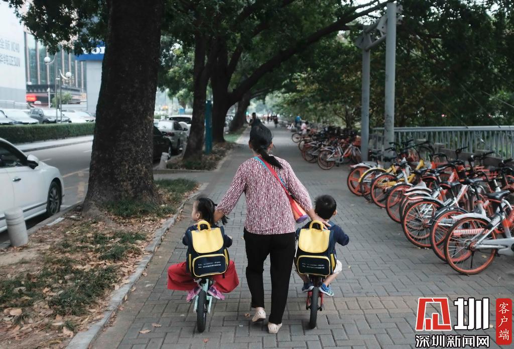 2019年10月28日,福田区,放学路上,一位家长带着两位小朋友。