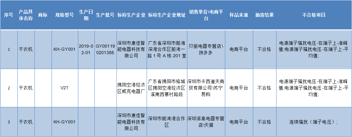 晶报2019年11月20日讯 近日,江苏省市场监管局对衣物干燥机产品质量进行了监督抽查,共抽查50批次。抽查结果显示,合格30批次,不合格20批次。其中,深圳有3批次不合格。分别是深圳市康佳智能电器科技有限公司生产的2批次干衣机,及揭阳空港经济区威克电器厂生产的在深圳市卡西道夫商贸有限公司、苏宁易购等电商平台销售的干衣机。