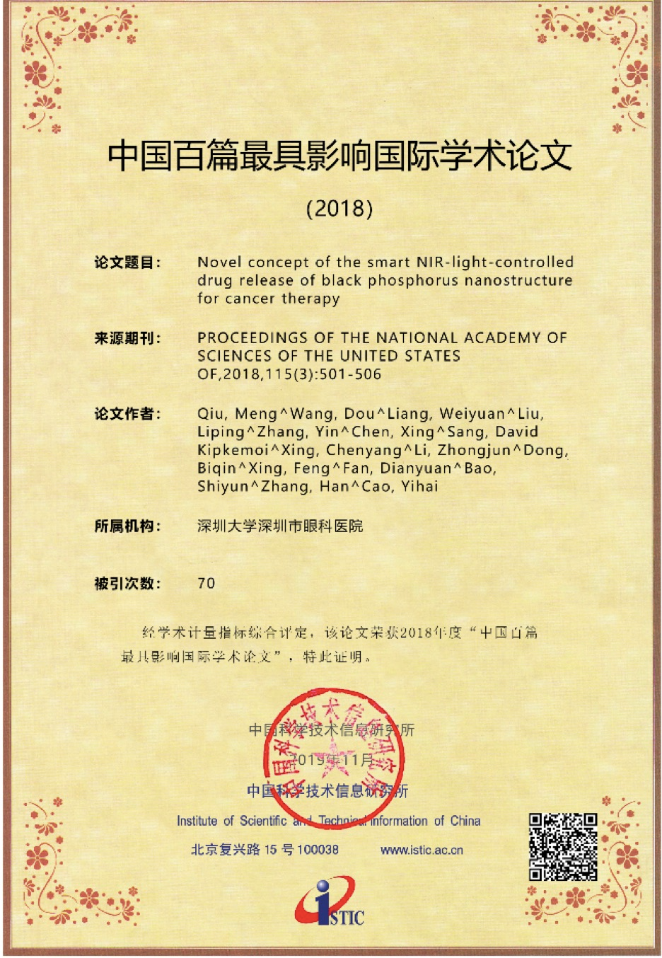 深圳特区报2019年11月22日讯 11月19日,中国科学技术信息研究所在北京召开中国科技论文统计结果发布会,公布了2018年中国百篇最具影响国际学术论文。深圳大学张晗教授课题组2篇论文入选,深大入选数量在中国内地高校和研究机构中并列第10。