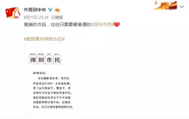 就连共青团中央都点名表扬:“高端的作品,往往只需要最普通的#深圳市民#”