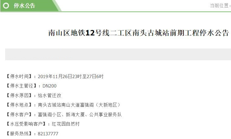 停水客户:东华物业、中国建筑第四工程有限公司、南油小学、东华假日公寓、深圳书城物业管理有限公司、中国建筑第四工程局有限公司、深圳市南山区城市管理局(文心公园)、深圳市万商物业管理有限公司