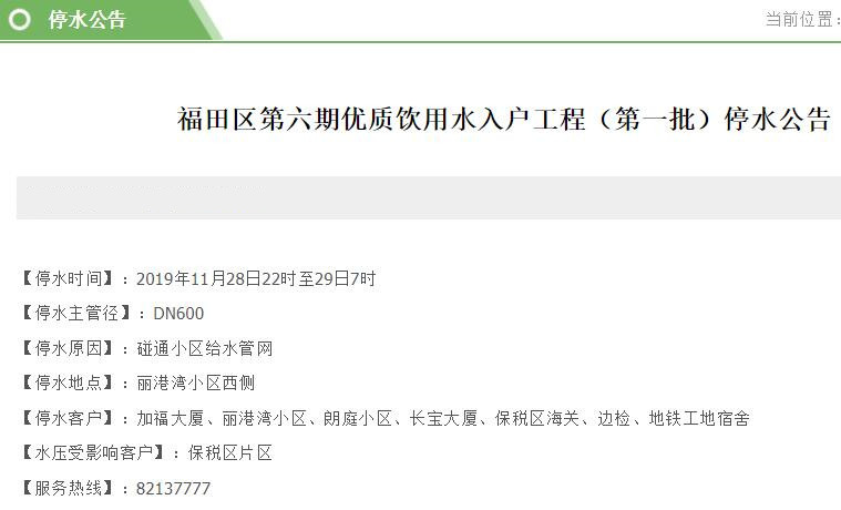 停水客户:加福大厦、丽港湾小区、朗庭小区、长宝大厦、保税区海关、边检、地铁工地宿舍